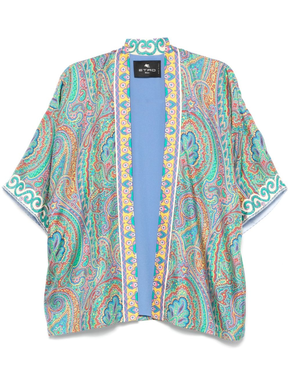 paisley-print open-front jacket Highlights - Cornflower blue - Open front - Short sleeves Made in Italy Composition Silk 100%, Viscose 100% SIZE & FIT Model measurements Height 5 ft 10 in(1.77 m) Bust/Chest 34.64 in(88 cm) Hips 35.43 in(90 cm) Waist 24.8 in(63 cm) FittingInformation Designed to be unstructured, offering a loose fit throughout Made from a lightweight non-stretch fabric