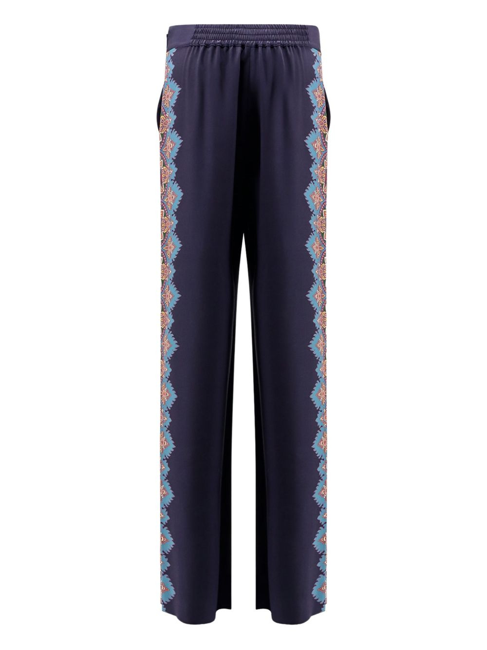paisley-print side-panel trousers Highlights - Dark blue - Paisley pattern - Side panels - Elasticated waistband - The item you receive may differ slightly from the item photographed. this is due to the artisanal nature with which all missoni products are constructed. Made in Italy Composition Silk 100% Washing instructions Read Manufacturer Guidelines
