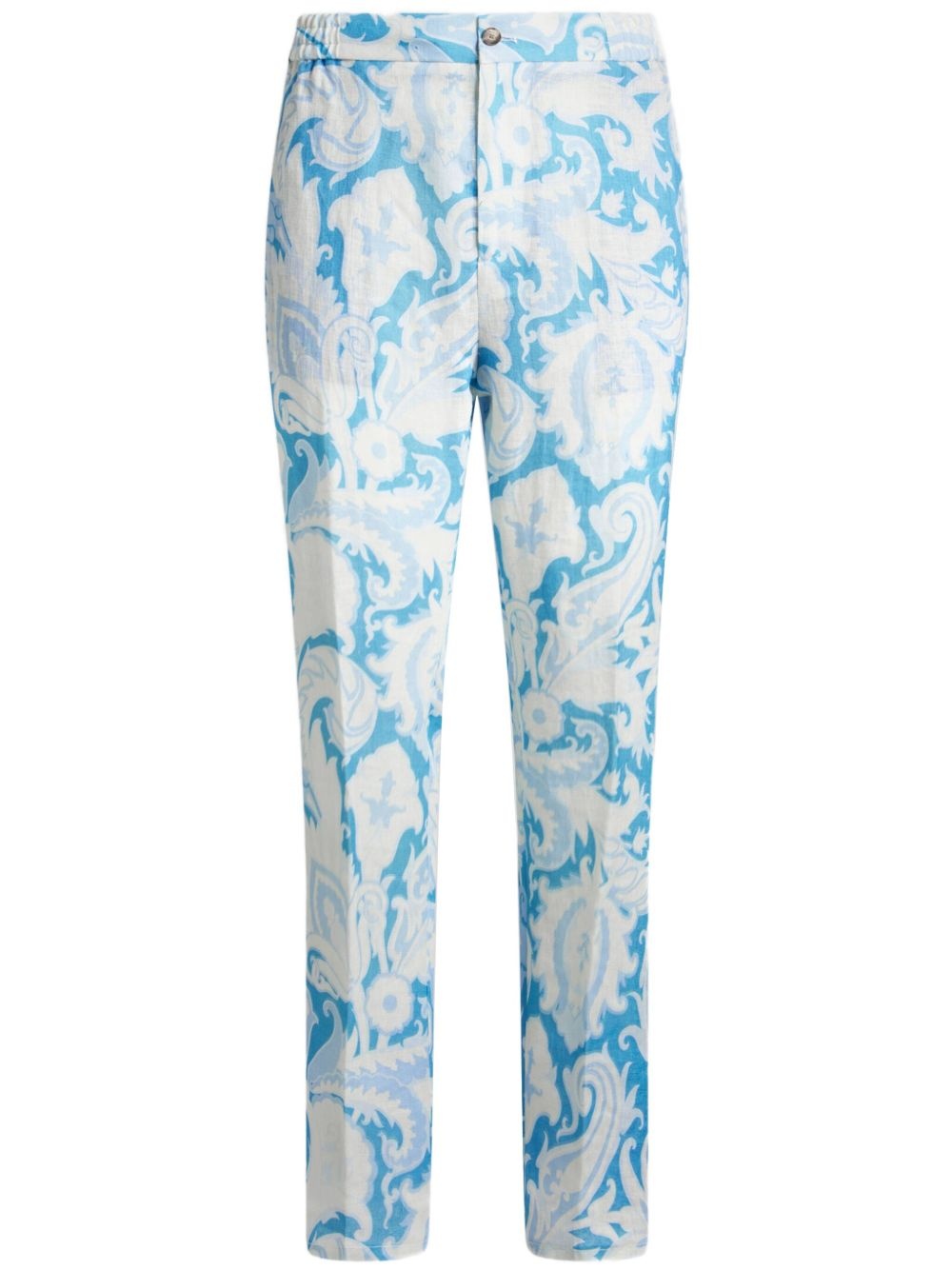 paisley-print trousers Highlights - Aqua blue - Front button fastening - Two side inset pockets - Two rear button-fastening pockets - Elasticated waistband Made in Italy Composition Linen/Flax 100%