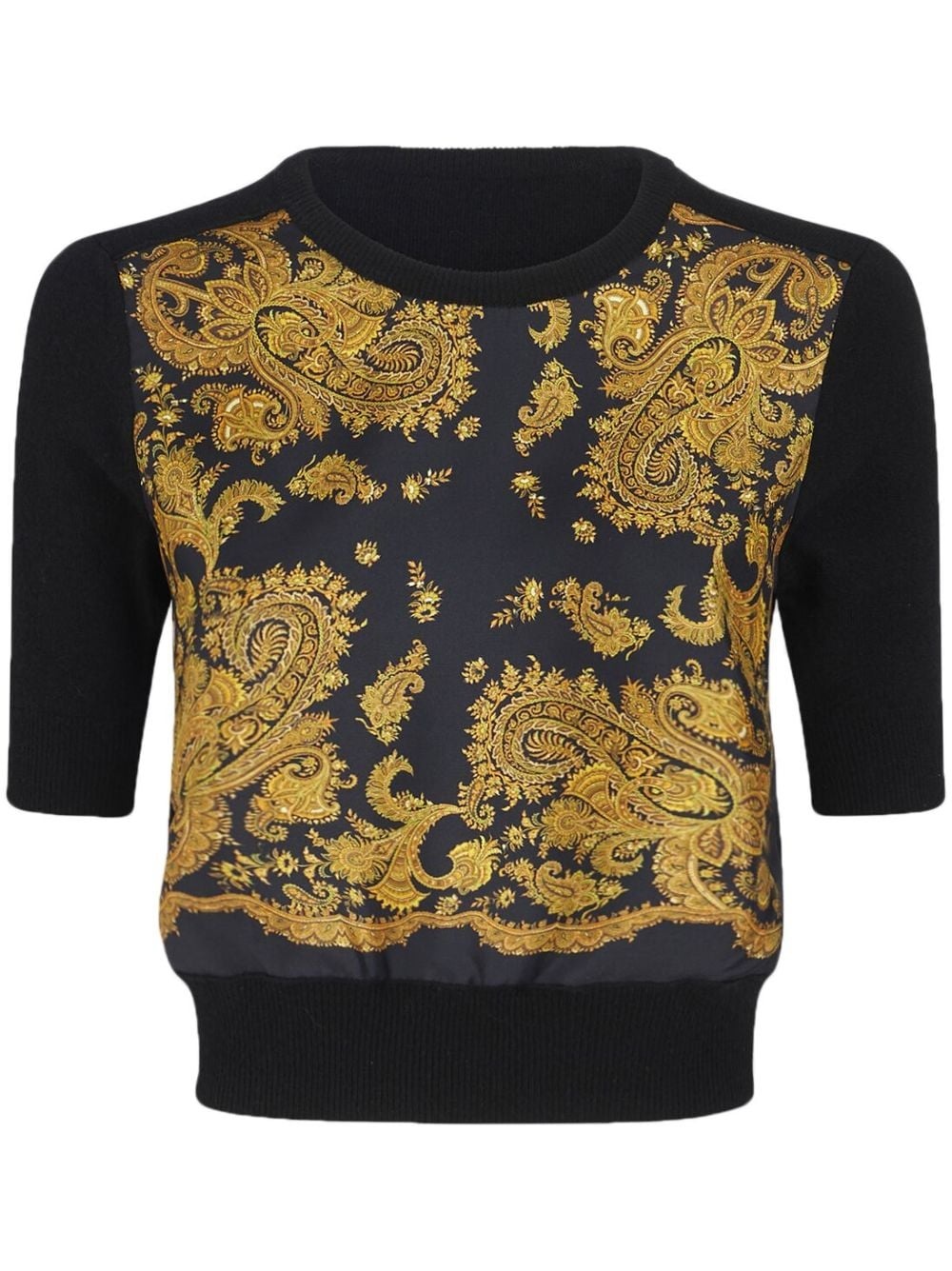 paisley-print panelled knitted top Highlights - Black/lemon yellow - Wool-cashmere blend - Ribbed detailing - Paisley print - Round neck - Short sleeves - Straight hem Made in Italy Composition Wool 70%, Cashmere 30%