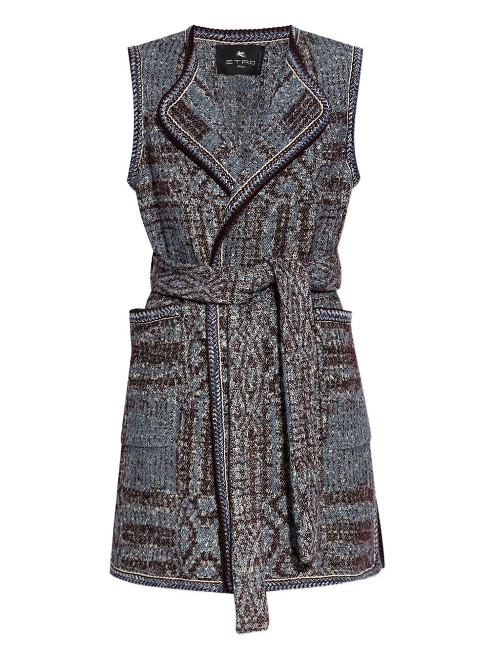 patterned-jacquard gilet Highlights - Blue/multicolour - Belted waist - Two front patch pockets - Sleeveless Made in Italy Composition Cotton 48%, Acrylic 41%, Wool 11% Washing instructions Read Manufacturer Guidelines
