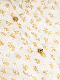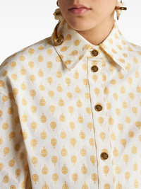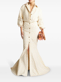patterned-jacquard mermaid gown Intricate motifs are a ETRO hallmark. A case in point, this white gown is crafted from cotton to a floor-sweeping mermaid silhouette enhanced with a patterned jacquard in yellow thread. It is finished with golden Pegaso-embossed buttons. Highlights - White - Cotton - Patterned jacquard - Signature pegaso motif - Gold-tone buttons - Mermaid silhouette - Spread collar - Front button placket - Long sleeves - Buttoned cuffs - Flared hem - Floor-length Made in Italy Composition Cotton 100% Washing instructions Dry Clean Only