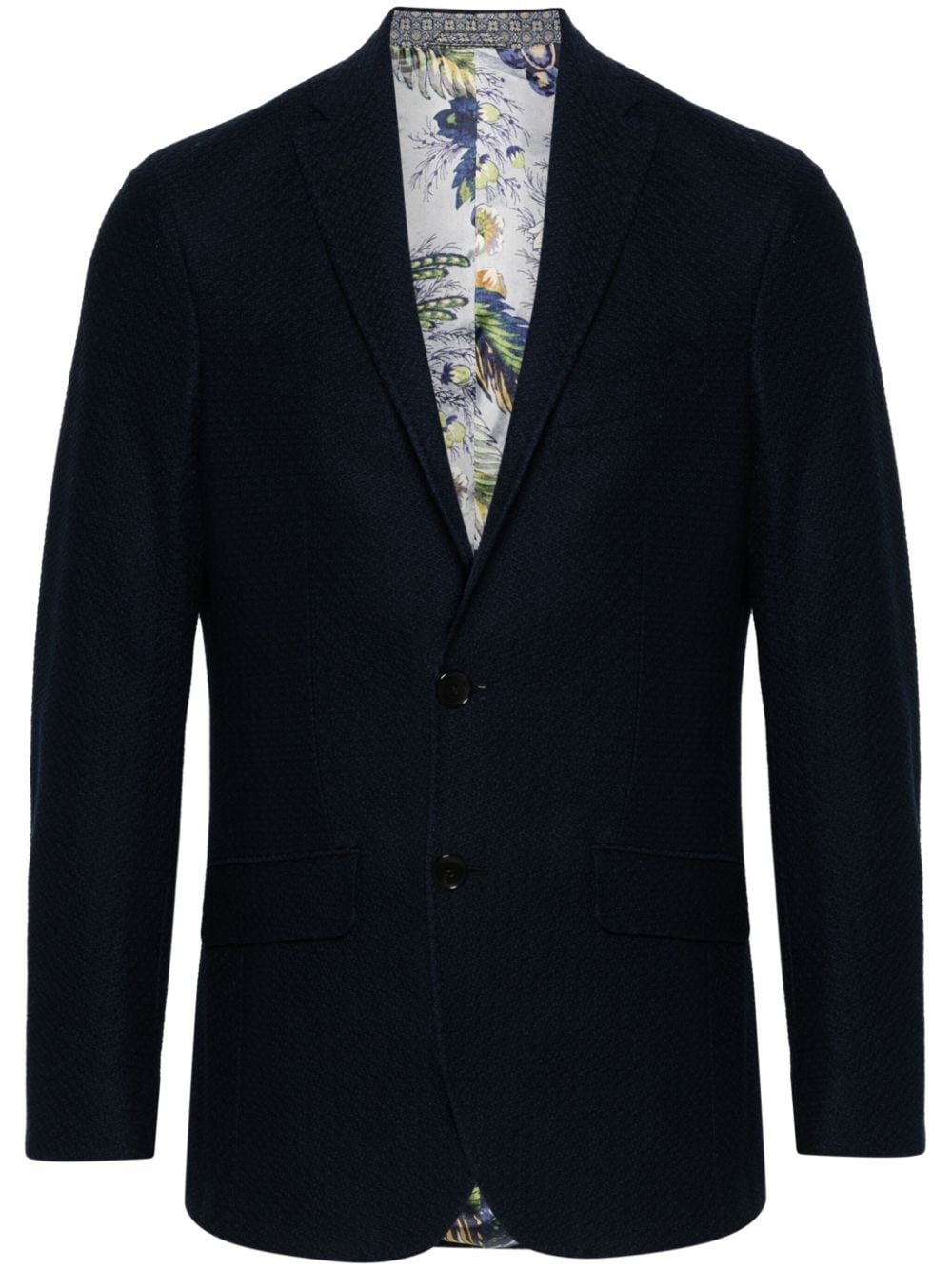 patterned-jacquard single-breasted blazer Highlights - Blue - Cotton - Jersey texture - Patterned jacquard - Notched lapels - Front button fastening - Long sleeves - Buttoned cuffs - Chest welt pocket - Two front flap pockets - English rear vents - Floral-print lining Made in Italy Composition Lining: Viscose 100% Outer: Cotton 100% SIZE & FIT Model measurements Height 6 ft 2 in(1.87 m) Bust/Chest 37 in(94 cm) Hips 33.85 in(86 cm) Waist 27.95 in(71 cm) FittingInformation Designed for a slim fit, offering a comfortable fit that sits just away from the body The vented hem offers movement at the rear Made from a midweight non-stretch fabric This piece fits true to size – take your usual size