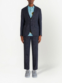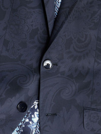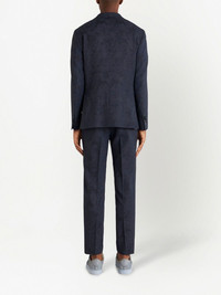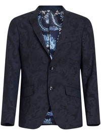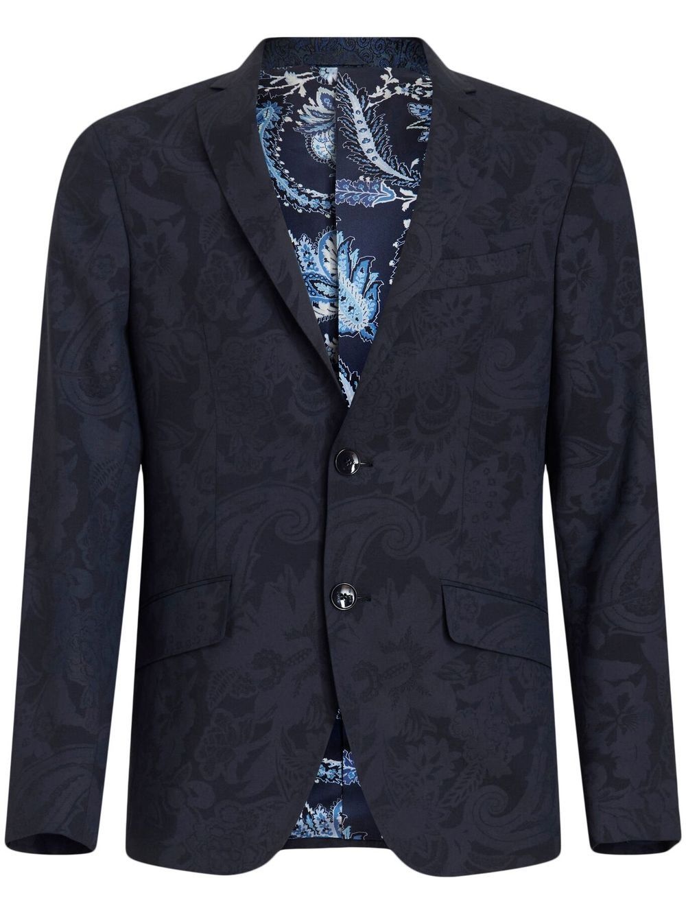 patterned-jacquard single-breasted blazer navy blue virgin wool blend tailored cut patterned jacquard paisley print notched lapels front button fastening chest welt pocket two front flap pockets buttoned cuffs long sleeves straight hem Made in Italy Composition Outer: Virgin Wool 99%, Elastane 1% Lining: Viscose 50%, Cupro 50% Sleeve Lining: Viscose 100%