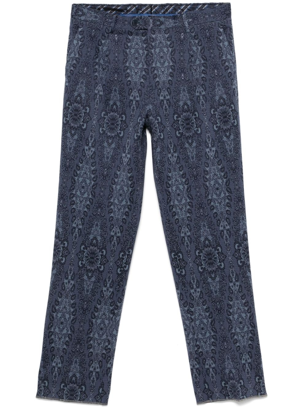 patterned-jacquard trousers Highlights - Navy blue - Concealed fly and button fastening - Two side slit pockets - Two rear button-fastening jetted pockets - Box-pleat detail Made in Italy Composition Cotton 48%, Polyester 36%, Viscose 14%, Polyamide 1%, Elastane 1% SIZE & FIT Model measurements Height 6 ft 2 in(1.87 m) Bust/Chest 38.18 in(97 cm) Hips 36.61 in(93 cm) Waist 29.13 in(74 cm) FittingInformation Designed for a slim tapered leg, offering a close fit that sits just away from the leg with a closer fit towards the ankle The unfinished hems allow for the length to be altered Made from a midweight stretch fabric, this piece offers elasticity and flexibility when worn