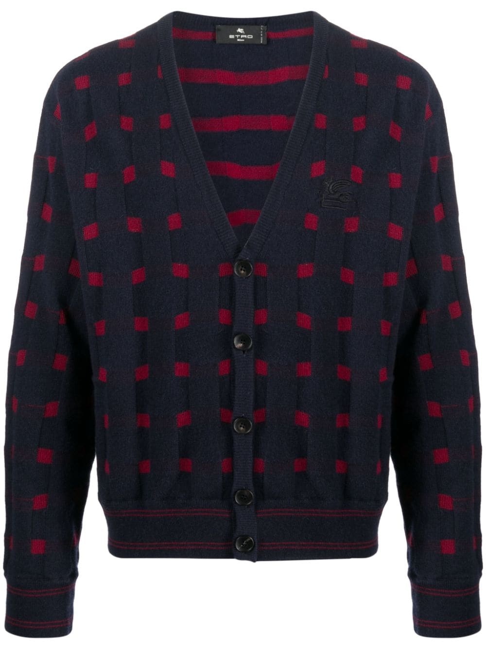 patterned-knit V-neck cardigan Highlights - Midnight blue/bordeaux red - Patterned intarsia knit - Stripe detailing - V-neck - Front button fastening - Long sleeves - Ribbed cuffs and hem Made in Italy Composition Wool 45%, Viscose 25%, Polyamide 20%, Cashmere 10% SIZE & FIT Model measurements Height 6 ft 2 in(1.87 m) Bust/Chest 38.18 in(97 cm) Hips 36.61 in(93 cm) Waist 29.13 in(74 cm) FittingInformation Designed for a relaxed fit, this piece allows for comfort and movement when worn Made with a midweight knit, this piece offers some stretch This piece fits true to size – take your usual size Washing instructions Hand Wash