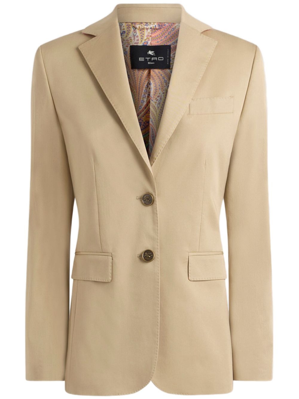 Pegaso-buttons cotton blazer Highlights - Beige - Front button fastening - Chest welt pocket - Two side flap pockets - Buttoned cuffs Made in Italy Composition Outer: Cotton 97%, Spandex/Elastane 3% Lining: Viscose 97%, Acetate 3% SIZE & FIT FittingInformation Designed for a slim fit that sits just away from the body offering a close yet comfortable fit The internal shoulder pads offer a structured shape Made from a midweight stretch fabric, this piece offers elasticity and flexibility when worn