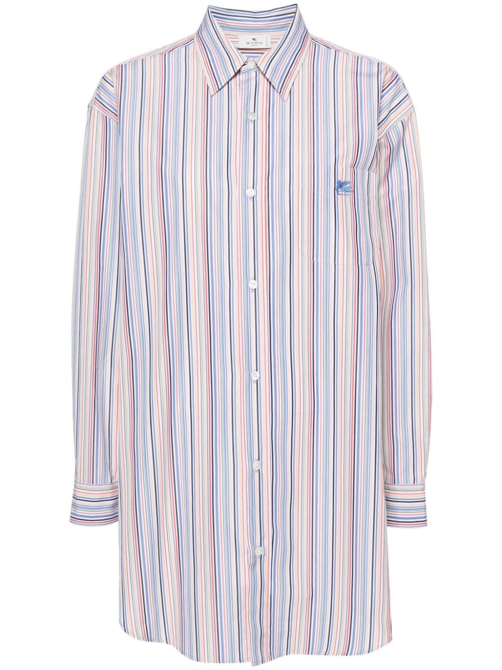 Pegaso-embroidered striped shirt ETRO's Pegaso motif symbolises 'the fountain of inspiration and creativity’ embedded in the brand's DNA. Embroidered at the chest of this long-sleeve striped shirt, the emblem adds a recognisable touch to the design. Highlights - Multicolour - Cotton - Poplin texture - Vertical stripe print - Signature pegaso motif - Embroidered logo at the chest - Classic collar - Front button fastening - Drop shoulder - Long sleeves - Buttoned cuffs - Chest patch pocket - Curved hem Made In Italy Composition Cotton 100% SIZE & FIT Model measurements Height 5 ft 10 in(1.79 m) Bust/Chest 32.67 in(83 cm) Hips 34.25 in(87 cm) Waist 24.4 in(62 cm) FittingInformation Designed to be unstructured, offering a loose fit throughout Made from a midweight non-stretch fabric This piece fits true to size – take your usual size Washing instructions Machine Wash