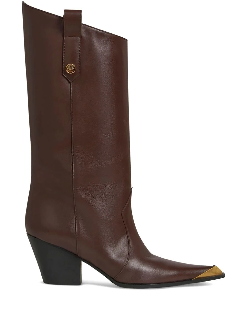 pointed-toe leather boots Highlights - Brown - Leather - Smooth grain - Pointed toe - Metal toecap - Gold-tone hardware - Signature pegaso motif - Mid block heel - Slip-on style Made in Italy Composition Outer: Brass 100%, Calf Leather 100% Sole: Calf Leather 100% Lining: Calf Leather 100% SIZE & FIT Measurement HEEL 2.36 in(6 cm)