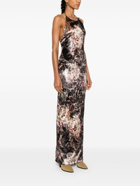 printed chenille maxi dress Highlights - Dark grey/multicolour - Chenille texture - Floral print - Single rear button fastening - Concealed rear hook and zip fastening - Halterneck - Sleeveless - Open back - Rear slit - Full lining - Straight hem - Long length Made in Italy Composition Outer: Polyester 92%, Elastane 8% Lining: Polyester 100% SIZE & FIT Model measurements Height 5 ft 10 in(1.78 m) Bust/Chest 33.07 in(84 cm) Hips 36.61 in(93 cm) Waist 24.8 in(63 cm) FittingInformation Designed for a slim fit that sits just away from the body offering a close yet comfortable fit The vented hem offers movement at the rear Made from a midweight stretch fabric, this piece offers elasticity and flexibility when worn
