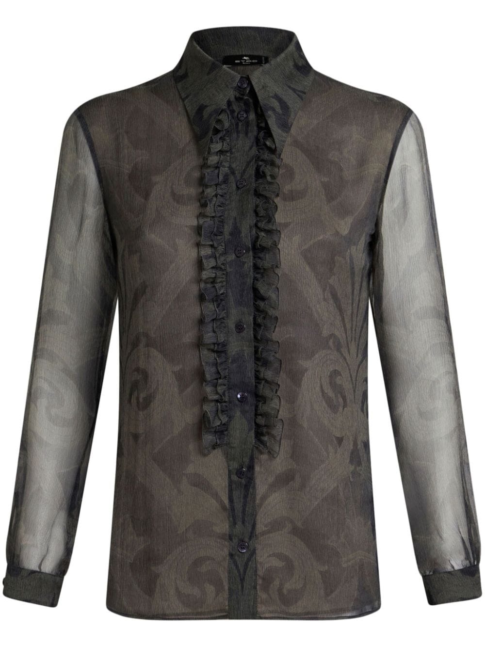 printed ruched shirt Highlights - Dark grey - Silk - Semi-sheer construction - Baroque-pattern print - Ruffled detailing - Front button fastening - Straight-point collar - Long sleeves - Buttoned cuffs - Straight hem Made in Italy Composition Silk 100%