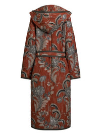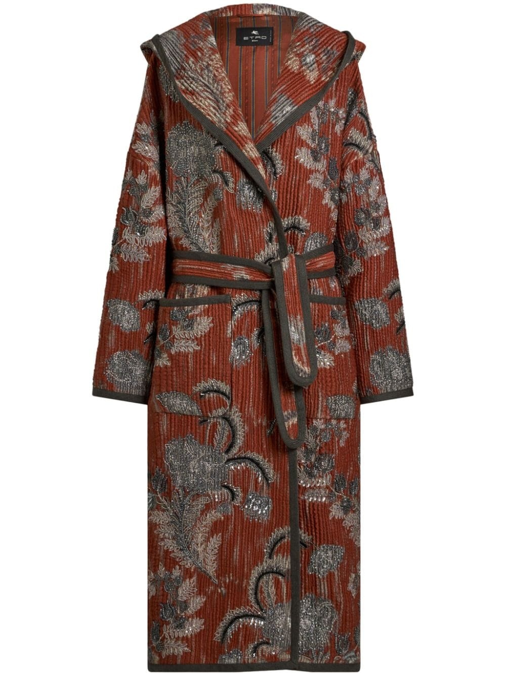 quilted jacquard coat Highlights - Rust red/grey - Quilted - Jacquard - Embroidered design - Classic hood - Tied waist - Long sleeves - Two front patch pockets - Straight hem Made In Italy Composition Outer: Polyester 34%, Wool 25%, Acrylic 25%, Silk 7%, Metallic Fibre 5%, Polyamide 4% Lining: Viscose 52%, Acetate 48%