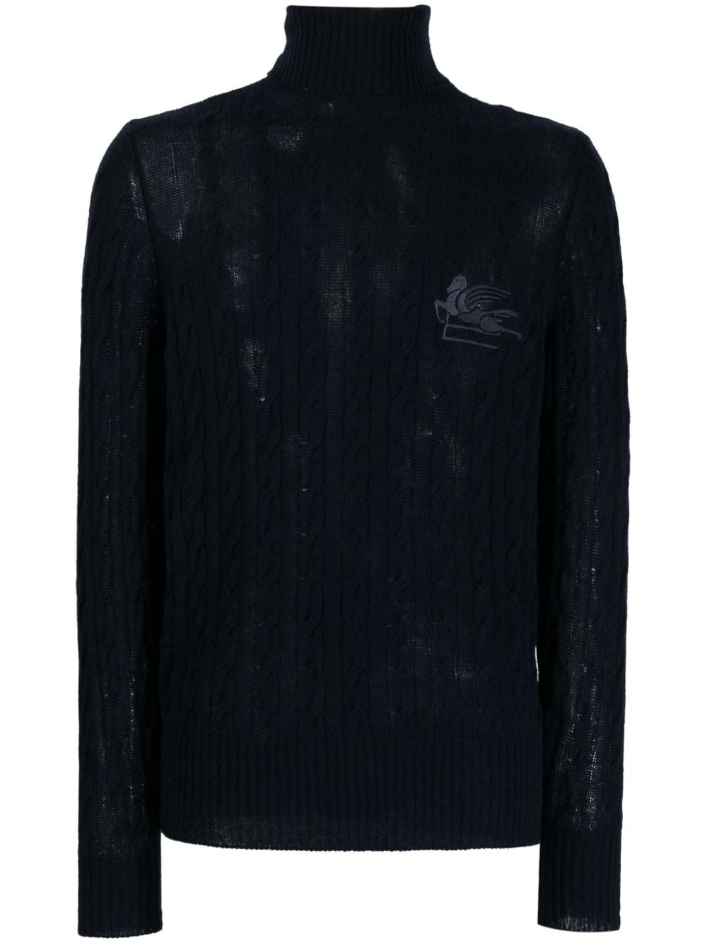 roll-neck cashmere cable-knit jumper Highlights - Navy blue - Cashmere - Signature pegaso motif - Cable knit - Roll neck - Long sleeves - Straight hem Made in Italy Composition Cashmere 100% SIZE & FIT Model measurements Height 6 ft 2 in(1.89 m) Bust/Chest 37.79 in(96 cm) Hips 37 in(94 cm) Waist 29.92 in(76 cm) FittingInformation Designed for a relaxed fit, this piece allows for comfort and movement when worn Made with a lightweight knit, this piece offers some stretch This piece fits true to size – take your usual size