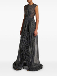 ruched-detail printed silk dress Highlights - Grey - Silk - Rear zip fastening - Paisley print - Sleeveless - Ruched detailing - Draped detailing - Pleated skirt - Faux-fur trim - Floor-length Made in Italy Composition Outer: Polyester 100%, Silk 100% Lining: Polyester 100%
