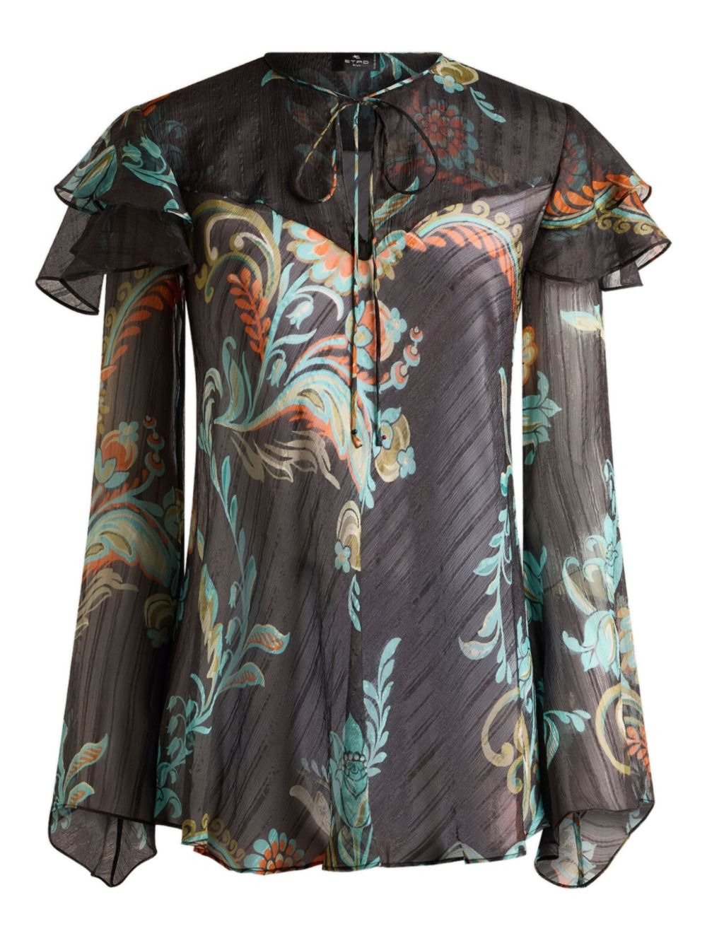 ruffled floral print blouse Highlights - Black - Daffodil motif - Ruffled neckline - Bell sleeves - Sheer fabric - Floral print Made in Italy Composition Silk 100% Washing instructions Read Manufacturer Guidelines