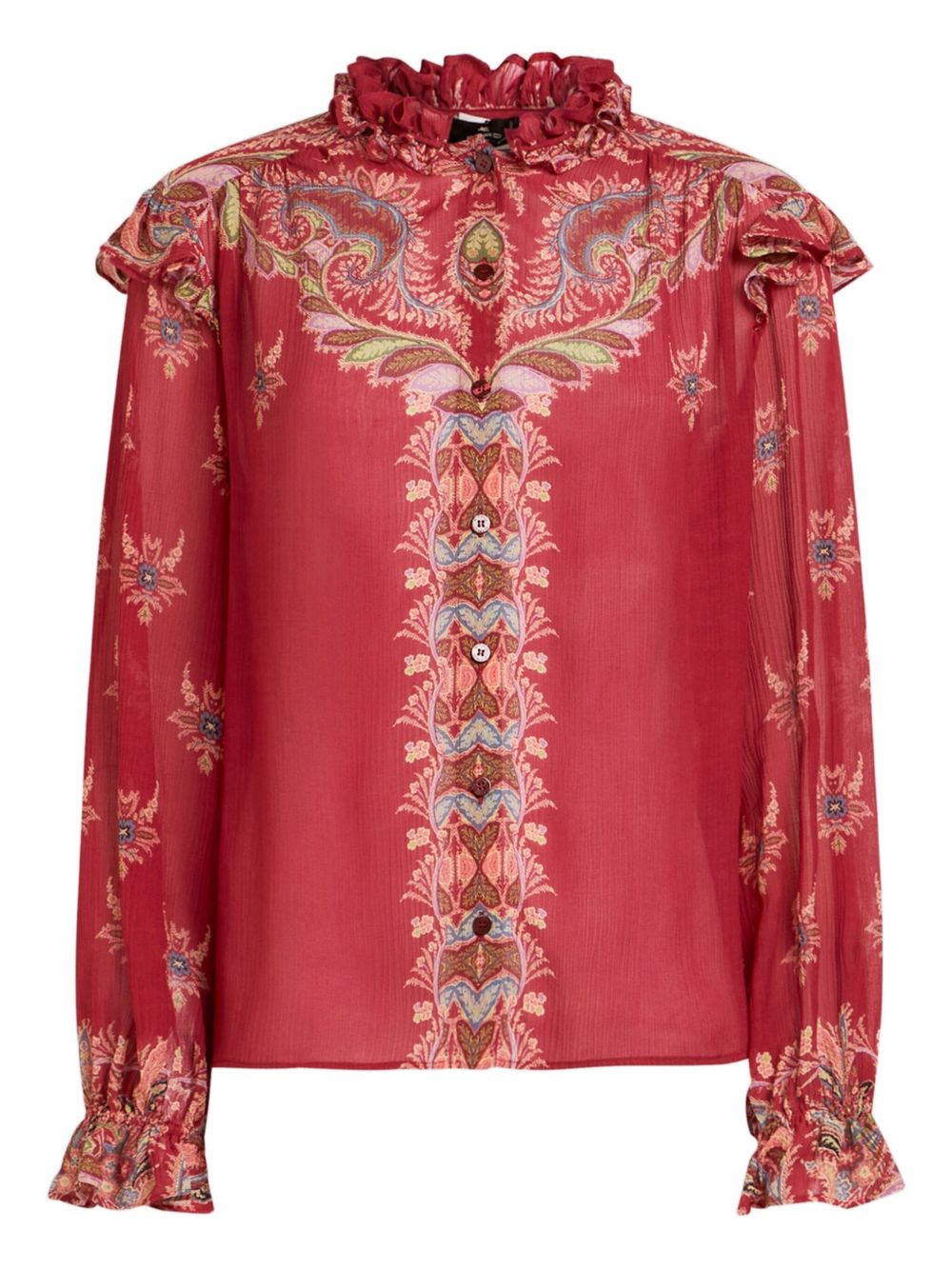 ruffled paisley-print blouse Highlights - Red - Paisley print - Ruffled collar - Long sleeves - Ruffled cuffs - Button fastening Made in Italy Composition Viscose 80%, Silk 20% Washing instructions Read Manufacturer Guidelines