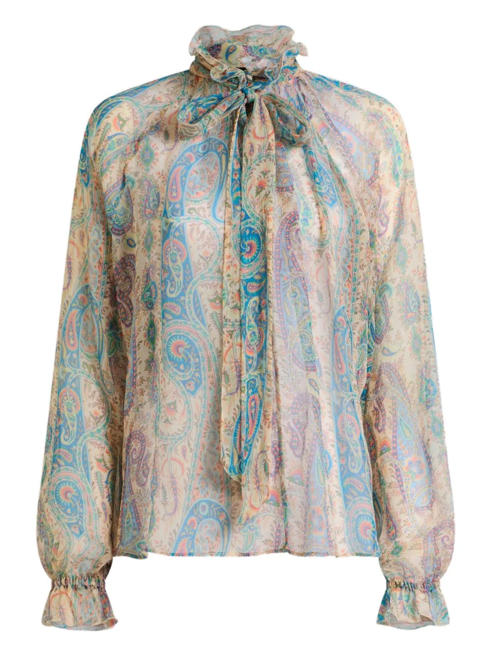 scarf-detail paisley-print silk blouse Highlights - Beige and multicoloured - Silk scarf - Paisley motif - Ruffled collar - Long sleeves - Ruffled cuffs Made in Italy Composition Silk 100% Washing instructions Read Manufacturer Guidelines