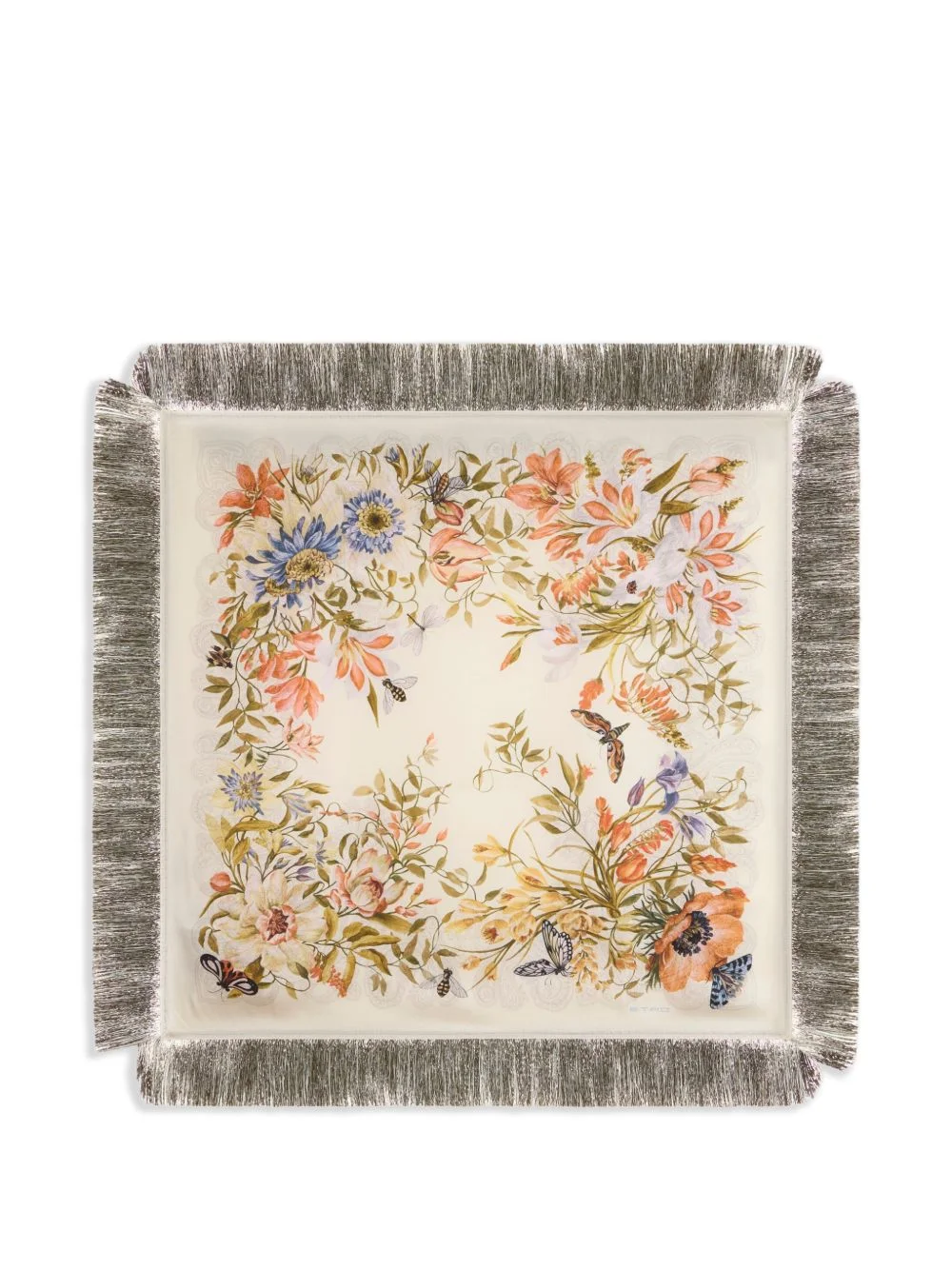 silk scarf Highlights - White/multicolour - Flora and fauna motif - Fringe edge Made in Italy Composition Base: Silk 100% SIZE & FIT Measurement WIDTH 27.55 in(70 cm)