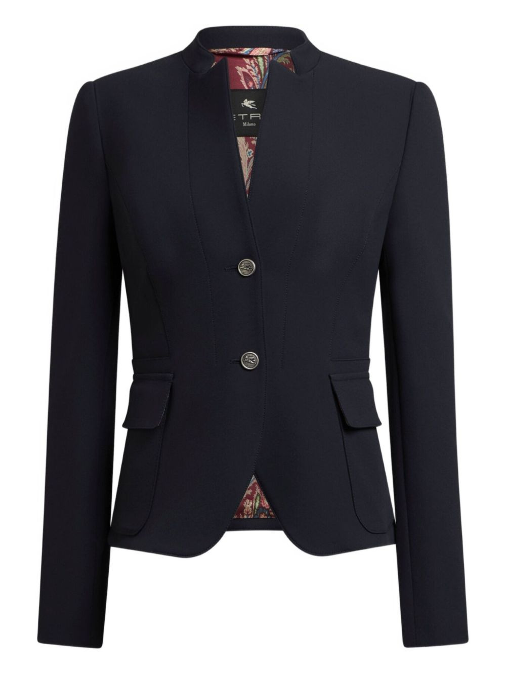 single-breasted blazer Highlights - Navy blue - Single-breasted - Buttoned - Flap pockets - Mandarin collar Made in Italy Composition Lining: Viscose 97%, Elastane 3% Outer: Polyamide 89%, Elastane 11% Washing instructions Dry Clean Only