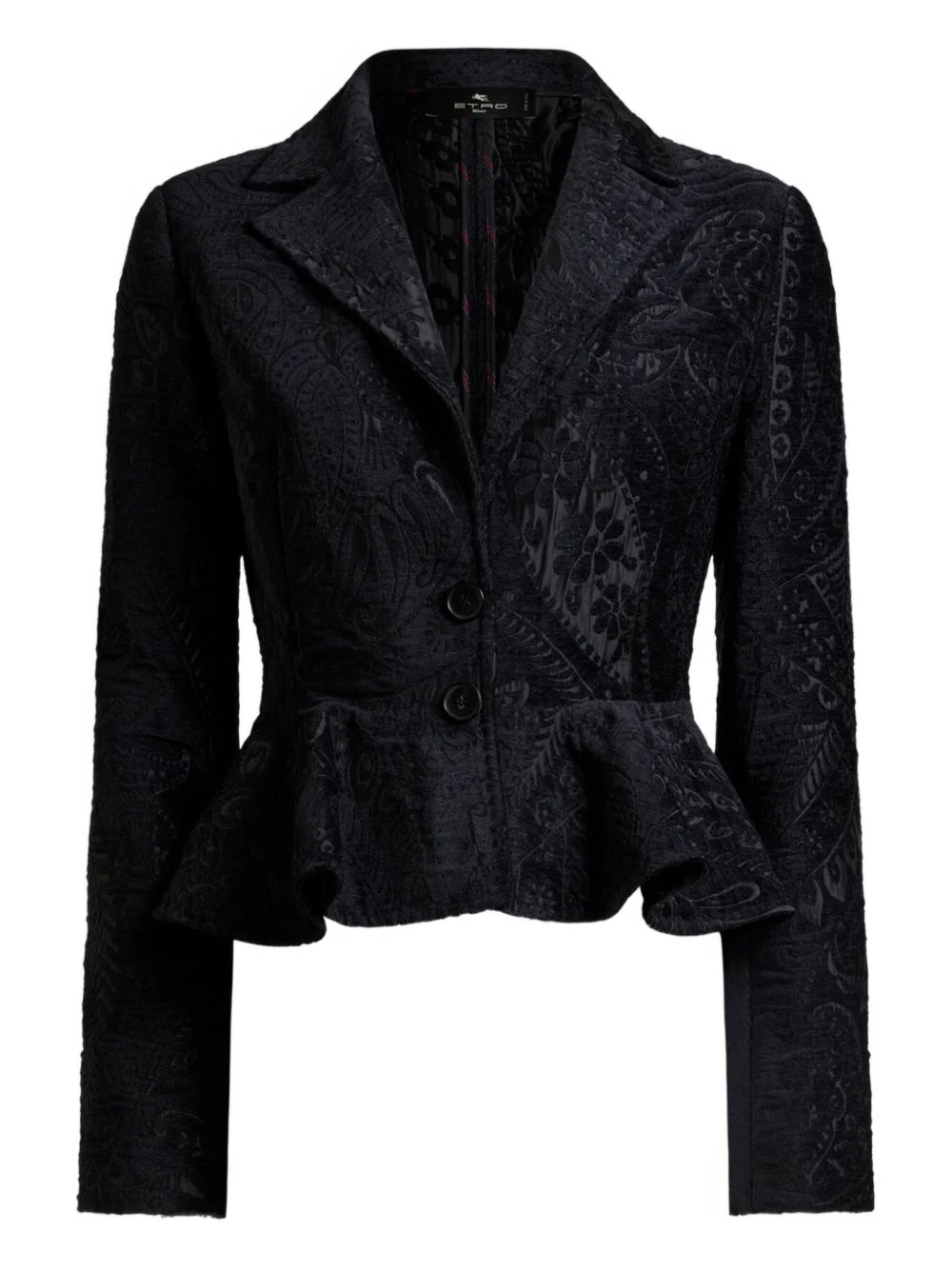single-breasted floral paisley blazer Highlights - Black - Floral paisley motif - Single-breasted - Button fastening - Peplum hem Made in Italy Composition Fabric 100% Washing instructions Read Manufacturer Guidelines