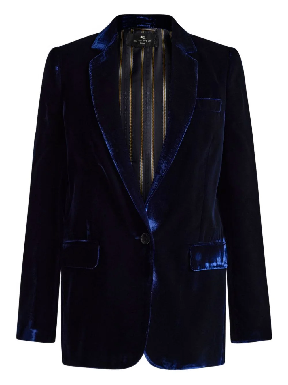 single-breasted velvet blazer Highlights - Blue - Velvet - Single-breasted - Button fastening - Notched lapels - Flap pockets Made in Italy Composition Outer: Viscose 69%, Cupro 31% Lining: Viscose 52%, Acetate 48%