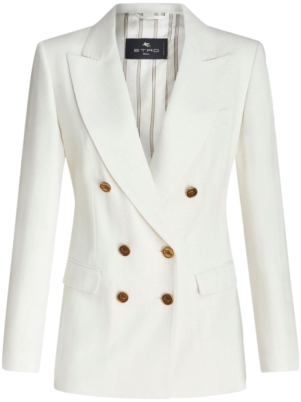 slub-texture double-breasted blazer Highlights - Eggshell white - Slub texture - Signature pegaso motif - Embossed gold-tone buttons - Wide peak lapels - Double-breasted button fastening - Long sleeves - Buttoned cuffs - Chest welt pocket - Two front flap pockets - American rear vent - Striped lining Made in Italy Composition Outer: Viscose 86%, Polyester 14% Lining: Viscose 52%, Acetate 48% SIZE & FIT Measurement SLEEVE LENGTH 24.8 in(63 cm) LENGTH 27.55 in(70 cm) WAIST 34.64 in(88 cm)