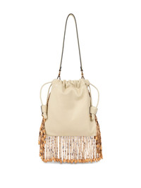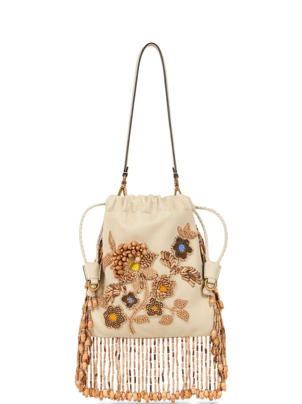 small Kalispera bucket bag Highlights - Light beige - Top drawstring fastening - Single top handle - Main compartment - Embroidered design Made In Italy Composition Outer: glass 100%, Leather 100% SIZE & FIT Measurement HEIGHT 8.66 in(22 cm) WIDTH 8.66 in(22 cm)