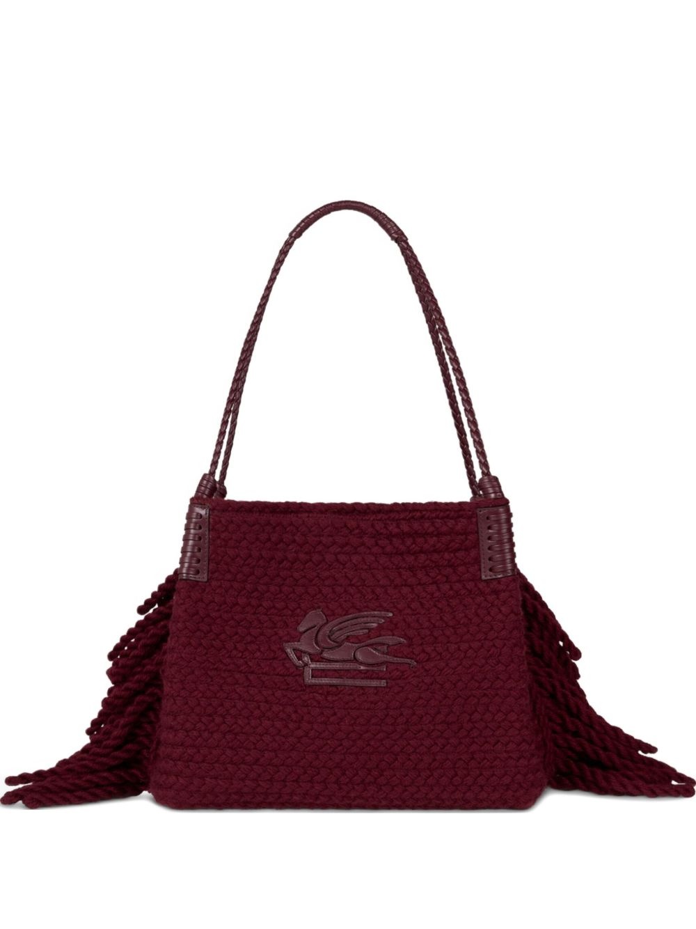 small Libra fringed tote bag Highlights - Dark red - Pegaso emblem - Braided top handles - Fringed edges Made in Italy Composition Outer: Calf Leather 100%, Wool 50%, Acetate 50% Lining: Cotton 100% SIZE & FIT Measurement DEPTH 6.29 in(16 cm) HEIGHT 11.41 in(29 cm) WIDTH 15.35 in(39 cm)