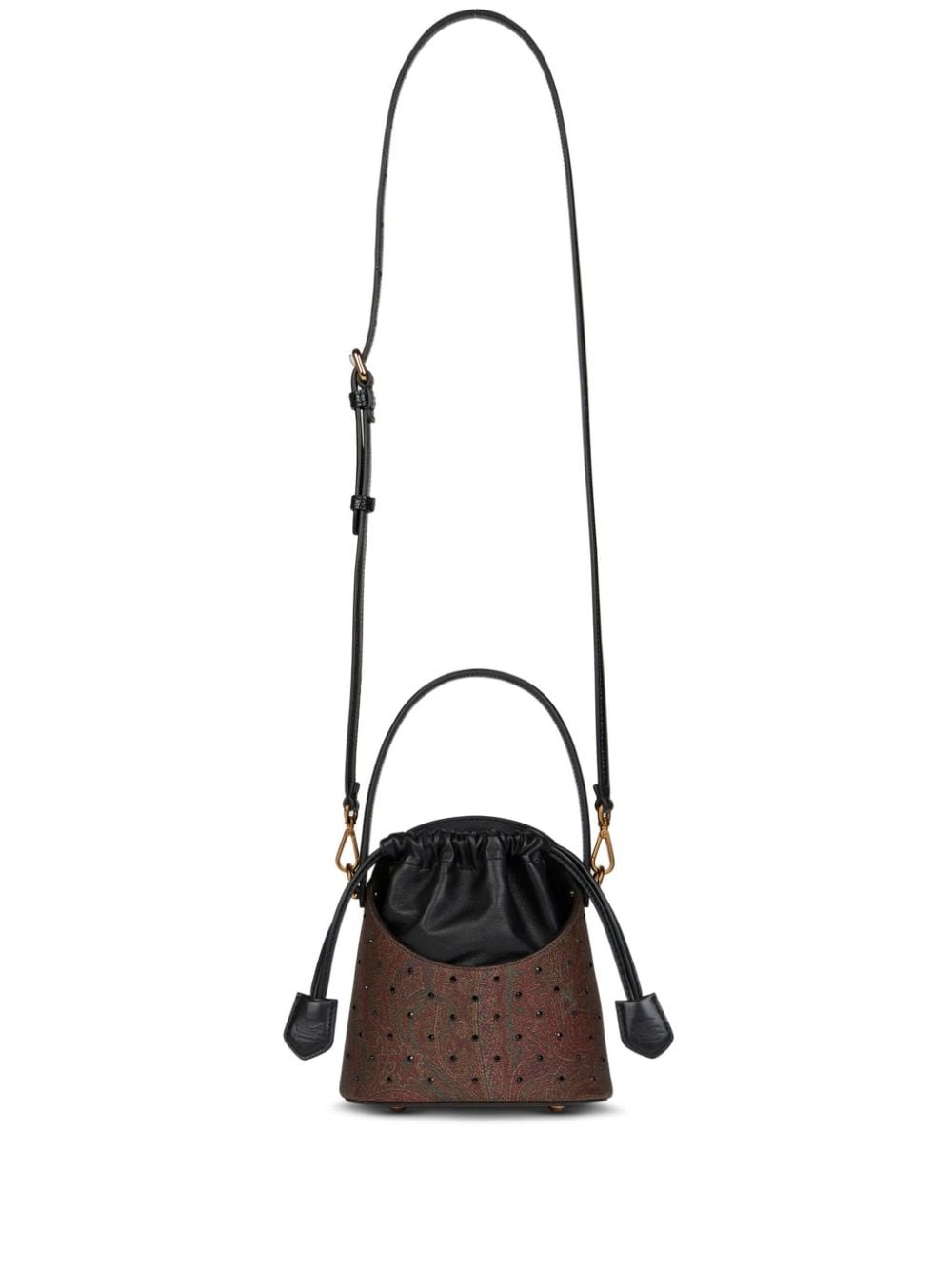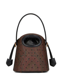 small Saturno bucket bag Highlights - Coffee brown/multicolour - Canvas/calf leather - Panelled design - Top drawstring fastening - Single detachable top handle - Adjustable detachable shoulder strap - Paisley print - Rhinestone embellishment - Main compartment - Striped lining Made in Italy Composition Outer: Polyurethane 100%, Calf Leather 100% SIZE & FIT Measurement DEPTH 4.72 in(12 cm) HEIGHT 7.08 in(18 cm) WIDTH 7.28 in(18.5 cm)