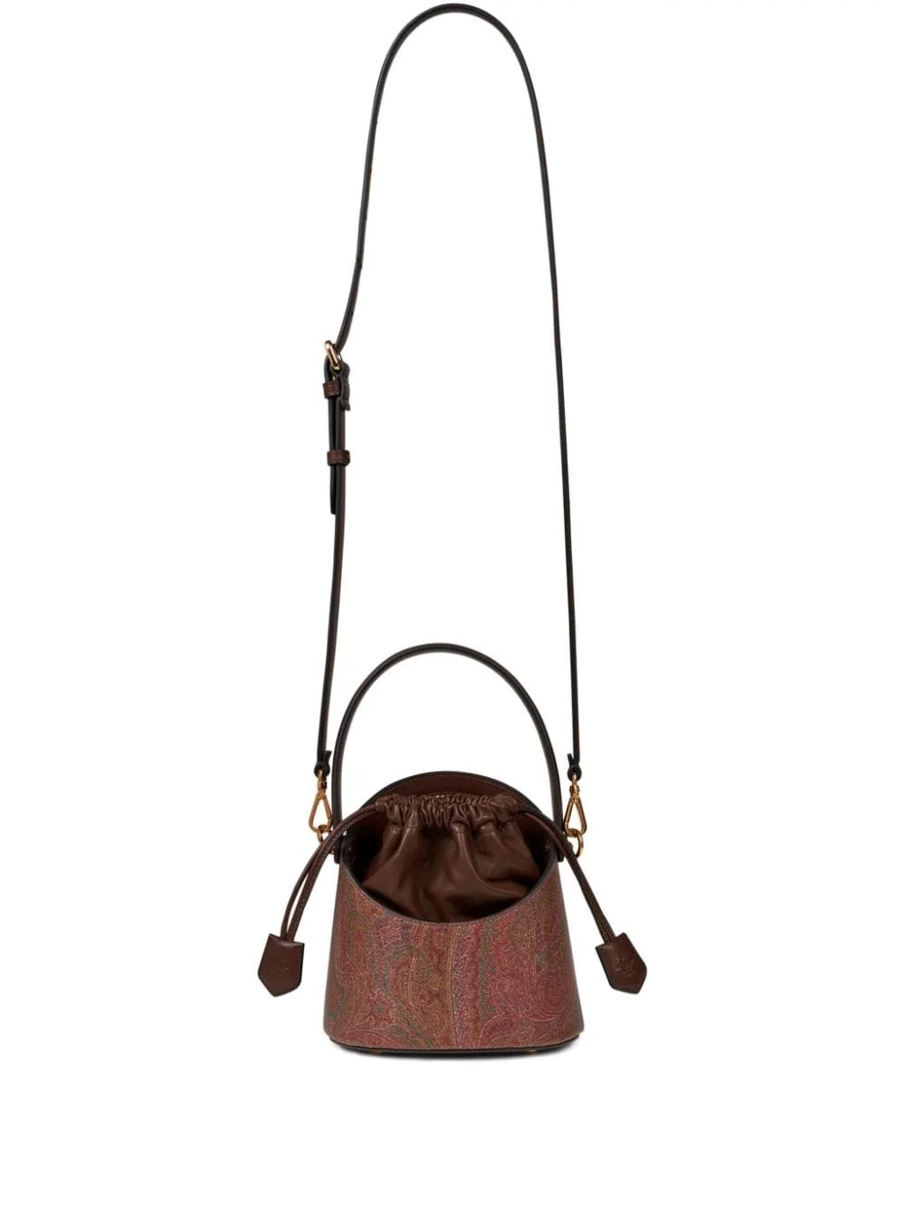 small Saturno paisley-print crossbody bag Highlights - Chocolate brown/multicolour - Paisley print - Embossed logo to the side - Top drawstring fastening - Single flat top handle - Adjustable detachable shoulder strap - Main compartment - Full lining - This piece comes complete with a protective dust bag. Made in Italy Composition Lining: Polyester 100% Outer: PVC 100%, Lambskin 100%, Cotton 76%, Polyester 24% SIZE & FIT Measurement DEPTH 4.72 in(12 cm) HEIGHT 7.08 in(18 cm) WIDTH 7.28 in(18.5 cm)