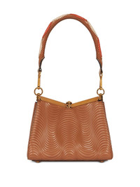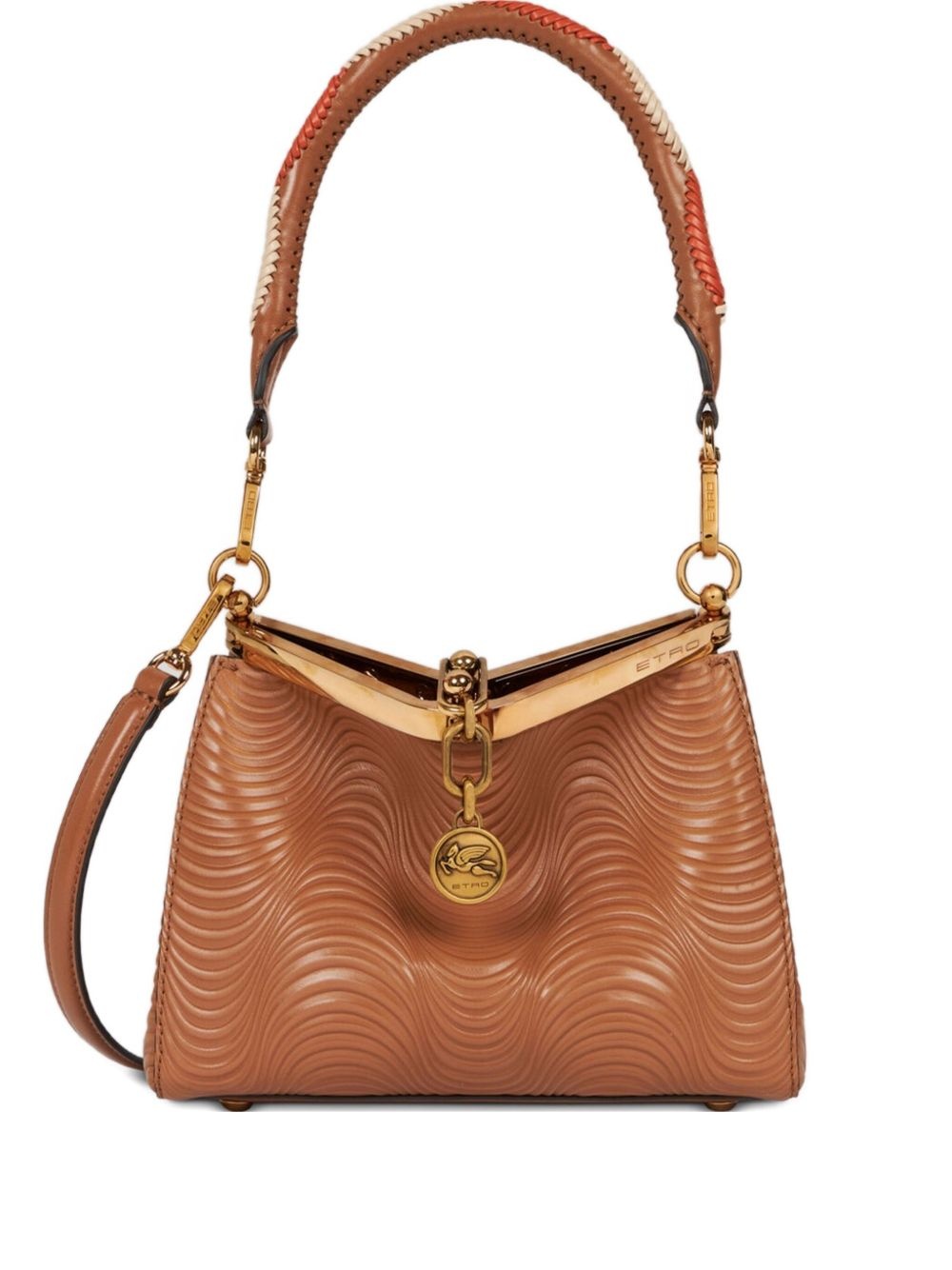 small Vela shoulder bag Highlights - Caramel brown - Clasp fastening - Single detachable top handle - Detachable shoulder strap - Logo charm Made in Italy Composition Lining: CALFSKIN 100% Outer: CALFSKIN 100% SIZE & FIT Measurement DEPTH 3.54 in(9 cm) HEIGHT 6.29 in(16 cm) WIDTH 8.26 in(21 cm)