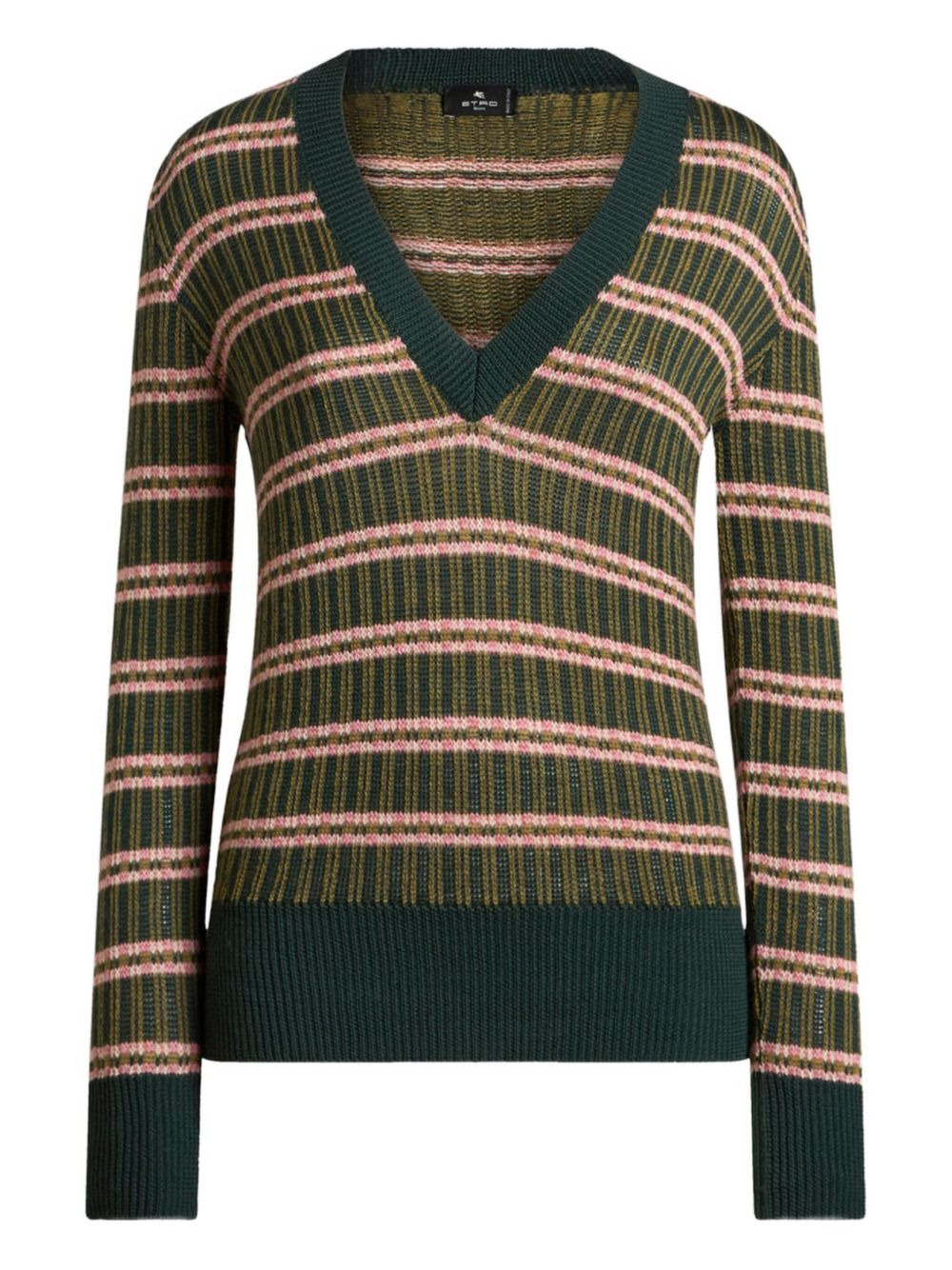 striped V-neck sweater Highlights - Dark green - V-neck - Striped pattern - Pink stripes - Olive green stripes - Wool blend Made in Italy Composition Wool 50%, Acrylic 50% Washing instructions Read Manufacturer Guidelines