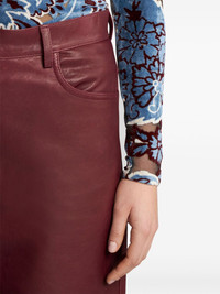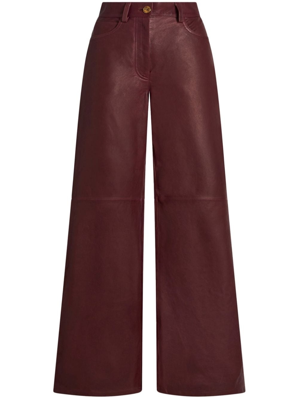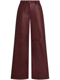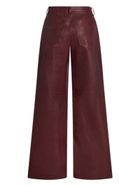 wide-leg leather trousers Highlights - Bordeaux red - Leather - Smooth grain - Belt loops - Mid-rise - Wide leg - Front button and zip fastening - Classic five pockets Made in Italy Composition Lambskin 100% SIZE & FIT Measurement FRONT RISE 12.51 in(31.8 cm) INSIDE LEG 29.01 in(73.7 cm) BACK RISE 14.01 in(35.6 cm) HIPS 34.01 in(86.4 cm) Hem Width 22.99 in(58.4 cm) WAIST 27 in(68.6 cm)