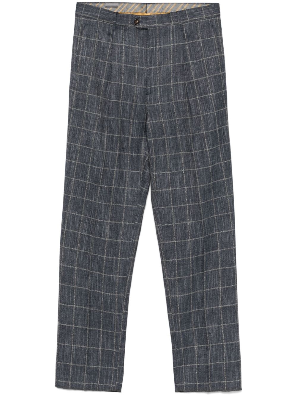 windowpane-pattern trousers Highlights - Indigo blue - Concealed fly and button fastening - Two side slit pockets - Two rear button-fastening jetted pockets - Box-pleat detail Made in Italy Composition Viscose 37%, Silk 32%, Linen/Flax 31% SIZE & FIT Model measurements Height 6 ft 2 in(1.87 m) Bust/Chest 38.18 in(97 cm) Hips 36.61 in(93 cm) Waist 29.13 in(74 cm) FittingInformation Designed for a slim tapered leg, offering a close fit that sits just away from the leg with a closer fit towards the ankle The unfinished hems allow for the length to be altered Made from a midweight non-stretch fabric