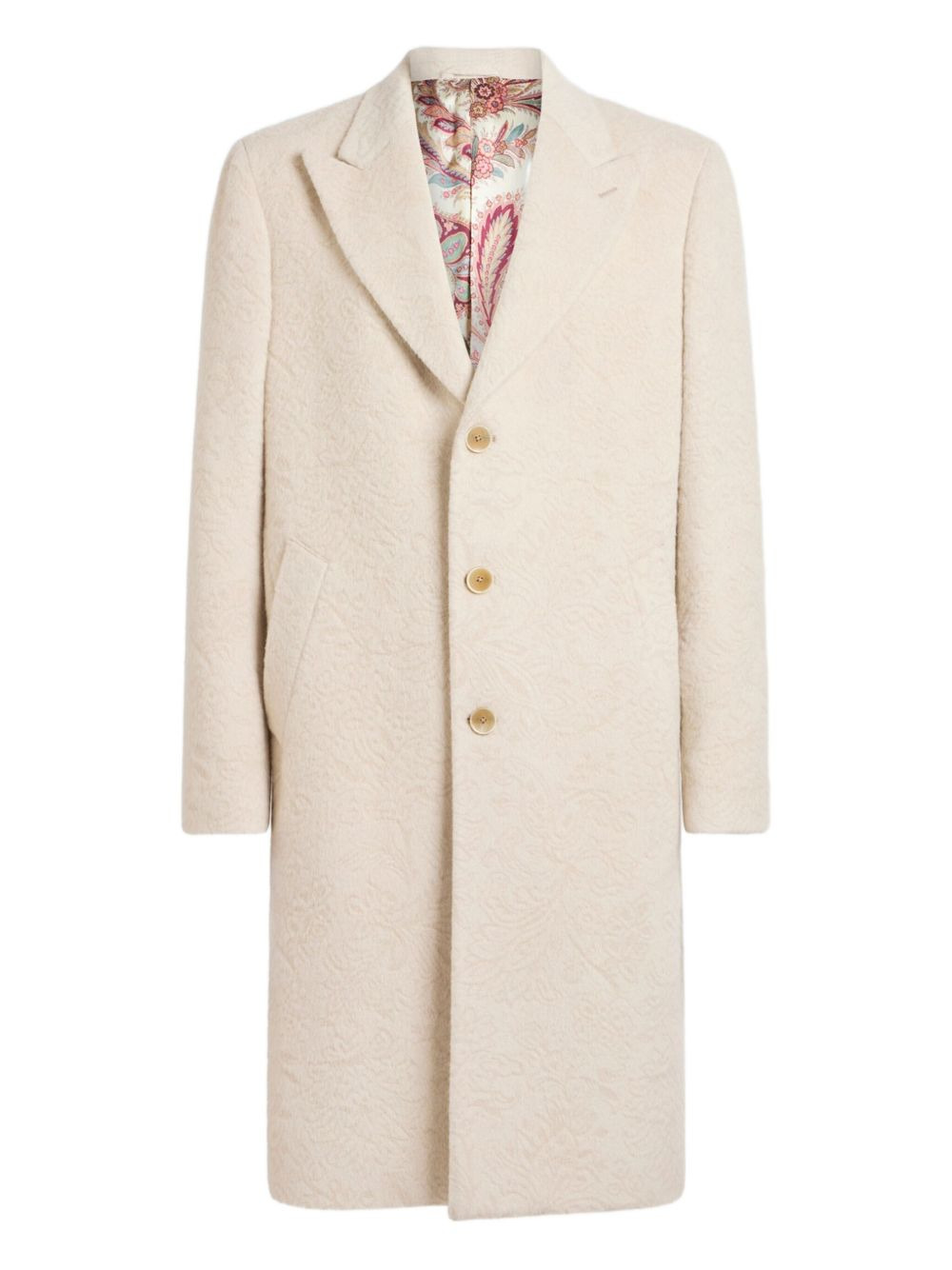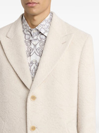 wool-blend single-breasted coat Highlights - Off-white - Wool-blend - Three-button fastening - Peaked lapels - Side pockets Made in Italy Composition Outer: Wool 63%, Polyamide 19%, Mohair 18% Lining: Viscose 100% Washing instructions Read Manufacturer Guidelines