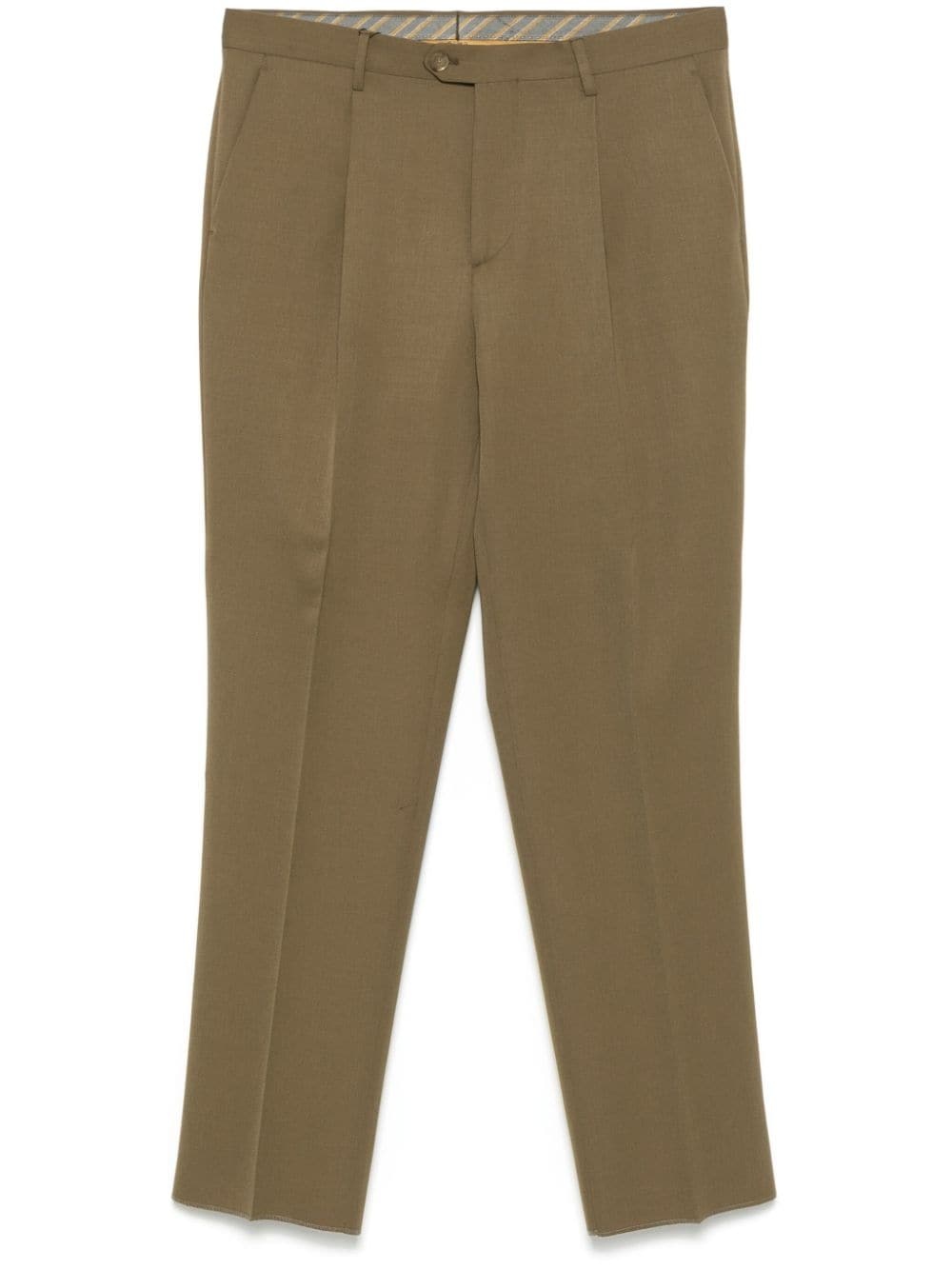 wool trousers Highlights - Golden brown - Wool - Twill weave - Front button and zip fastening - Two side slash pockets - Pleat detailing - Two rear button-fastening jetted pockets - Straight leg Made in Italy Composition Lining: Acetate 60%, Viscose 40% Outer: Wool 100% SIZE & FIT Model measurements Height 6 ft 2 in(1.87 m) Bust/Chest 37.79 in(96 cm) Hips 37.79 in(96 cm) Waist 30.31 in(77 cm) FittingInformation Designed for a tapered leg, offering a loose unrestricted fit over the leg with a closer fit towards the ankle The unfinished hems allow for the length to be altered Made from a midweight non-stretch fabric