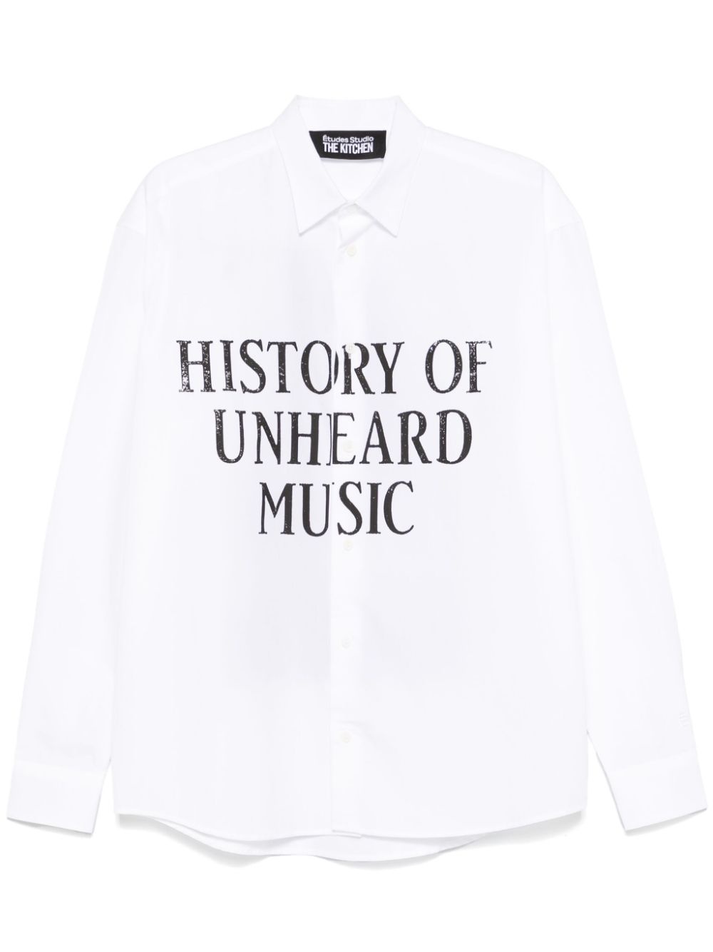 x The Kitchen Classic shirt Highlights - White/black - Cotton - Poplin texture - Front button fastening - Classic collar - Long sleeves - Buttoned cuffs - Text print to the front - Illustration-style print to the rear - Curved hem - When buying this unisex item, keep in mind that it is graded in standard men's sizing. Imported Composition Cotton 100%