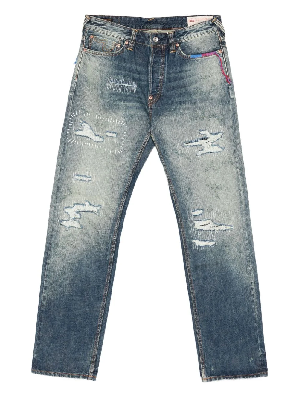 distressed jeans Highlights - Indigo - Distressed effect - Patchwork detailing - Five pockets - Button and zip fastening - Belt loops Imported Composition Cotton 100% SIZE & FIT Model measurements Height 6 ft 1 in(1.85 m) Bust/Chest 35.82 in(91 cm) Hips 37.79 in(96 cm) Waist 29.13 in(74 cm) Washing instructions Read Manufacturer Guidelines