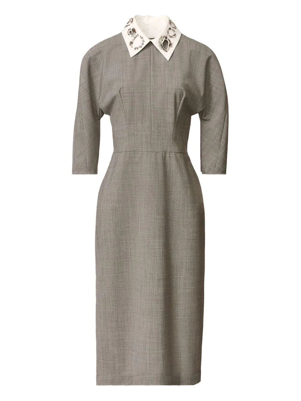 embellished-collar midi dress Highlights - Grey - Crystal embellishment - Contrasting collar - Fitted bodice - Three-quarter sleeves - Centre rear vent - Concealed rear zip fastening Made in Italy Composition Fabric 100% Washing instructions Read Manufacturer Guidelines