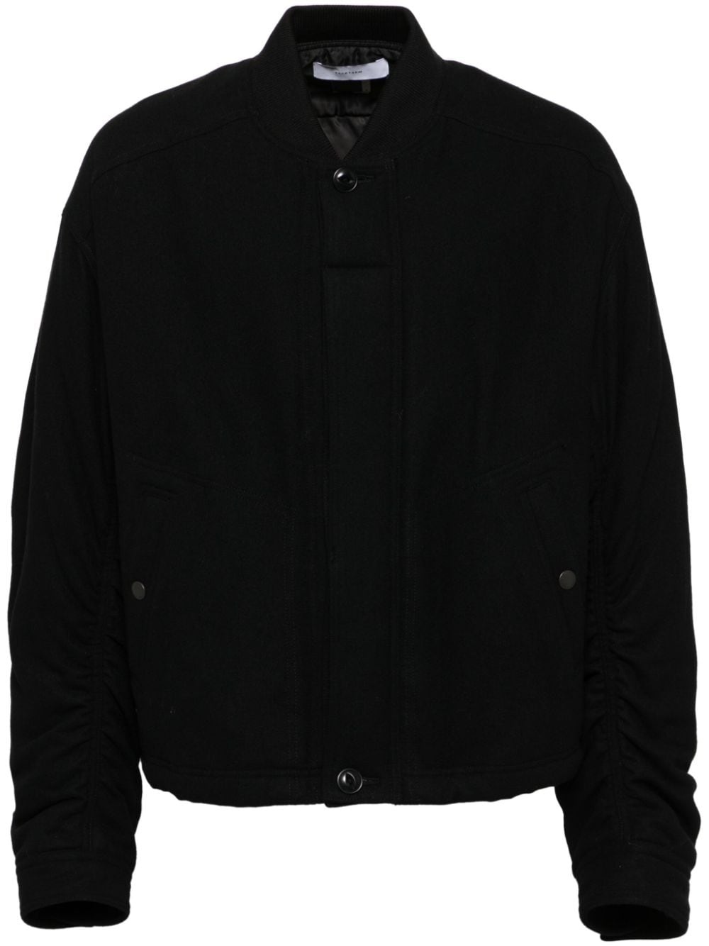 cropped jacket Highlights - Black - Wool blend - Front button fastening - Baseball collar - Two side button-fastening pockets - Long sleeves - Drop shoulder - Draped detailing - Buttoned cuffs - Full lining Imported Composition Lining: Cupro 100% Outer: Wool 90%, Nylon 10% Filling: Polyester 100% SIZE & FIT Model measurements Height 6 ft 1 in(1.85 m) Bust/Chest 35.43 in(90 cm) Hips 36.22 in(92 cm) Waist 28.74 in(73 cm) FittingInformation Designed for an oversized fit, offering additional room throughout Constructed with additional length on the sleeve Made from a midweight non-stretch fabric