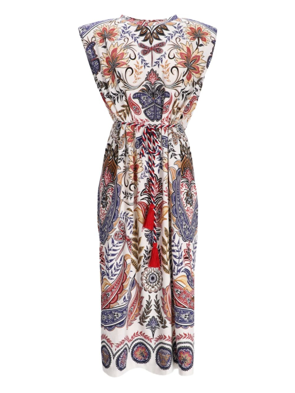 Boho Glam floral midi dress Highlights - Ivory white - Floral embroidery - Tassel detail - Elasticated waist - Round neckline - Cap sleeves - Intricate patterns Imported Composition Organic Cotton 100% Washing instructions Machine Wash