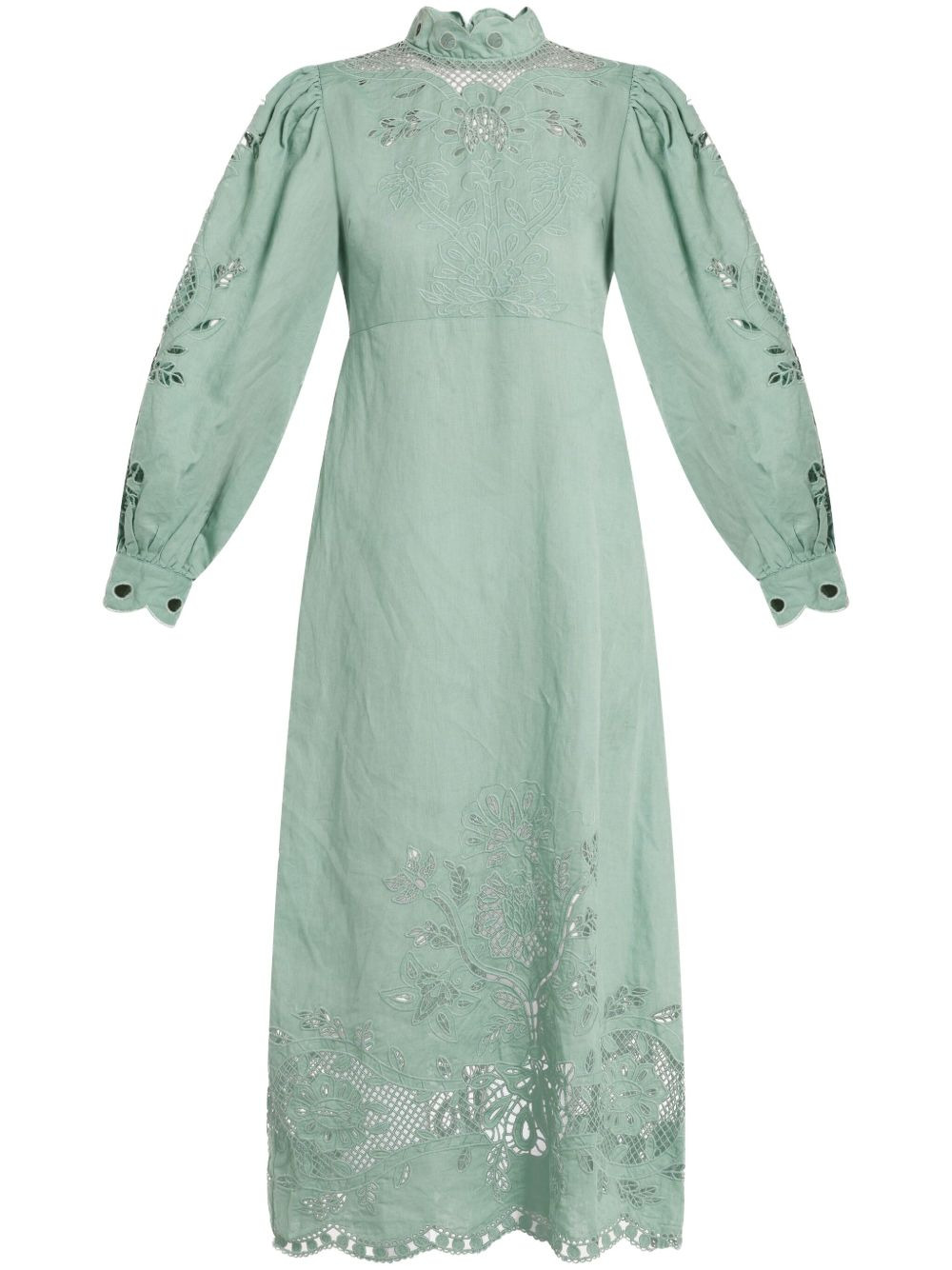 embroidered midi dress Highlights - Aqua blue - Rear button fastening - High neck - Eyelet detailing - Long sleeves - Scallop hem Imported Composition Linen/Flax 53%, Cotton 47% Washing instructions Hand Wash