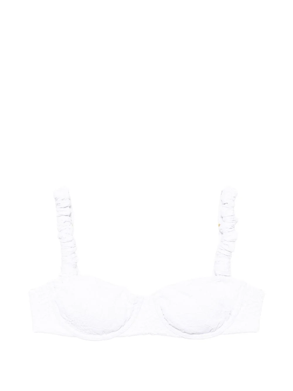floral-embroidered bikini top Highlights - White - Rear buckle fastening - Ruffled straps - Be mindful to try on swimwear over your own garments. Imported Composition Elastane 100%, Polyamide 97% Washing instructions Machine Wash