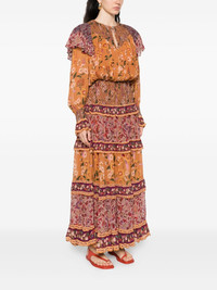 Colorful Birds Camel Smocking Long Sleeve Maxi Dress