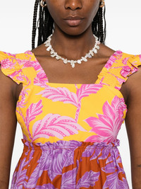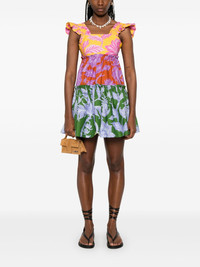 floral-print mini dress Highlights - Amethyst purple - Concealed side hook and zip fastening - Shirred panel - Ruffled trim - Tiered skirt Imported Composition Outer: Cotton 100% Lining: Viscose 100% SIZE & FIT Model measurements Height 5 ft 10 in(1.78 m) Bust/Chest 31.49 in(80 cm) Hips 37 in(94 cm) Waist 23.62 in(60 cm) FittingInformation Designed for a close fit at the chest with a loose fit over the waist and hips The elasticated shoulders offer movement and a comfortable fit Made from a midweight non-stretch fabric Washing instructions Machine Wash