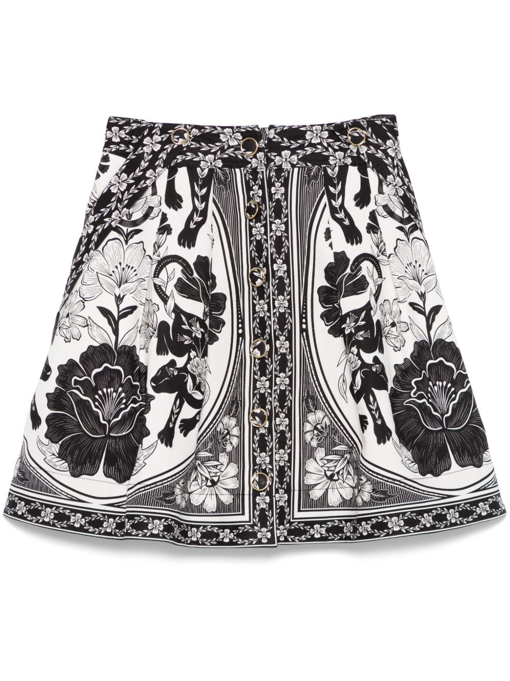 Flower Leopard mini skirt Highlights - White - Front button fastening - Two side welt pockets Imported Composition Lining: Viscose 100% Outer: Cotton 54%, Lyocell 46% SIZE & FIT Model measurements Height 5 ft 10 in(1.78 m) Bust/Chest 33.85 in(86 cm) Hips 36.61 in(93 cm) Waist 26.77 in(68 cm) FittingInformation This mini-length skirt is intended to be worn high on the waist Made from a midweight non-stretch fabric Washing instructions Machine Wash
