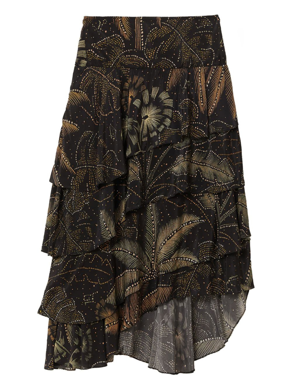 foliage tiered printed midi skirt Highlights - Black - Tropical print - Tiered ruffles - Asymmetrical hem Imported Composition Fabric 100% Washing instructions Read Manufacturer Guidelines