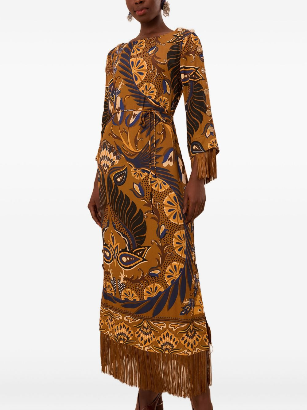Gold Heart Forest lenzing™ ecovero™ maxi dress Highlights - Brown - Floral print - Long sleeves - Fringe trim - Self-tie belt Imported Composition EcoVero Viscose (LENZING) 100% Washing instructions Read Manufacturer Guidelines