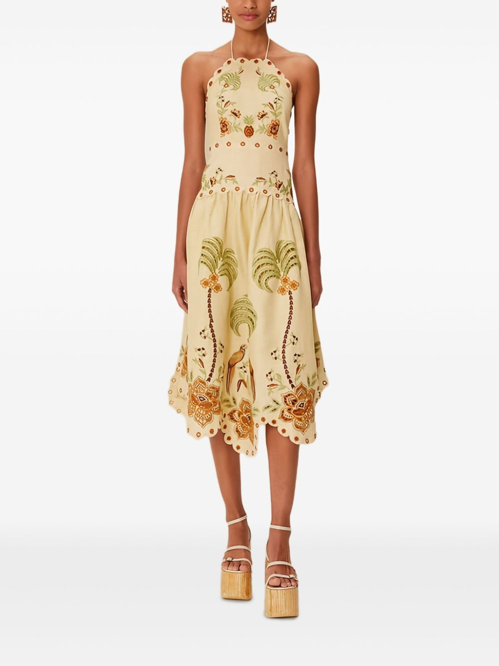 halter-neck embroidered midi dress Highlights - Sand - Embroidered detail - Scalloped hem - Halterneck tie fastening - Button fastening - Floral print Imported Composition Linen/Flax 100% Washing instructions Read Manufacturer Guidelines