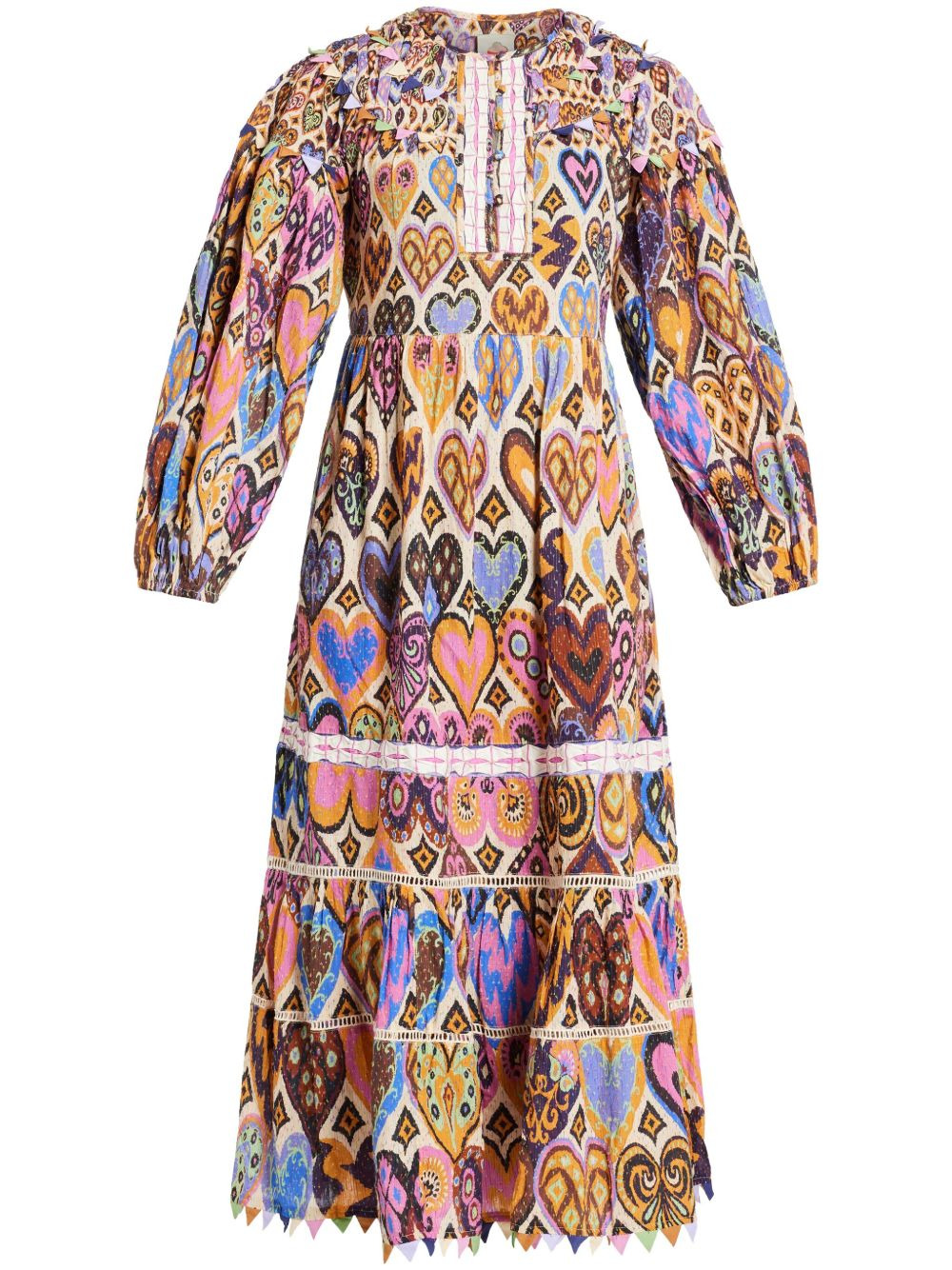 heart-print midi dress Highlights - Multicolour - Cotton - All-over graphic print - Heart print - Panelled design - Front button placket - Crew neck - Long sleeves - Elasticated hem - Scallop hem - Mid-length Imported Composition Cotton 100% Washing instructions Machine Wash